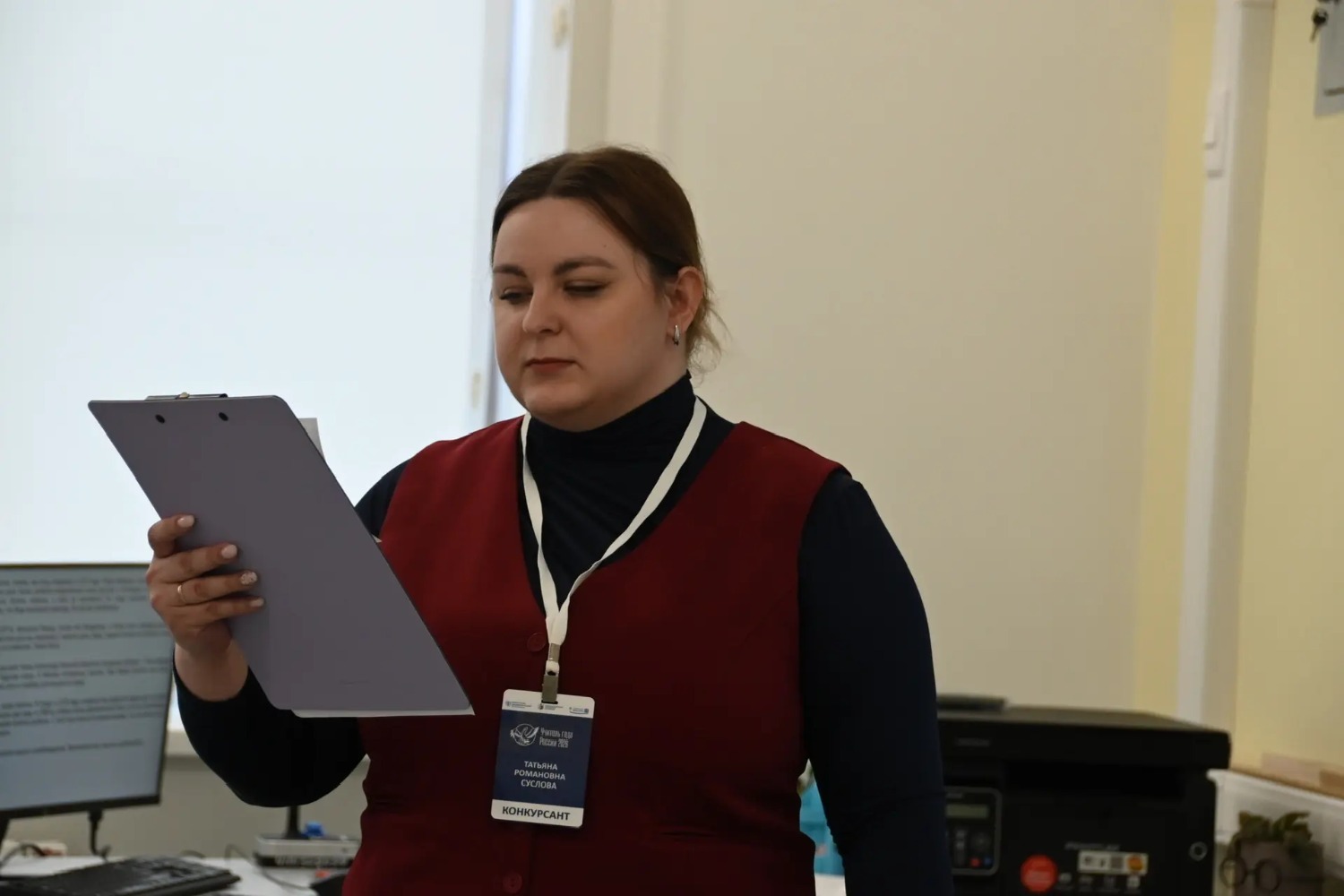 В рамках первого тура Татьяна Суслова продемонстрировала свои профессиональные навыки, успешно проведя и проанализировав урок, а также приняв участие в педагогическом интервью.