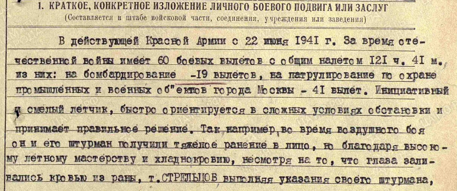 Во время боя снаряд угодил в кабину машины Стрельцова. Летчик был ранен: осколки металла глубоко врезались в лицо, кровь залила глаза. «Я ничего не вижу!» — крикнул он штурману. Тот не ответил. Правой рукой Стрельцов ощупал напарника. Жив! Но переговорное устройство не работало — перебит шнур. «Игорь, я ничего не вижу! Садись рядом, помогай вести самолет. Кричи мне на ухо, куда лететь», — попросил Стрельцов.