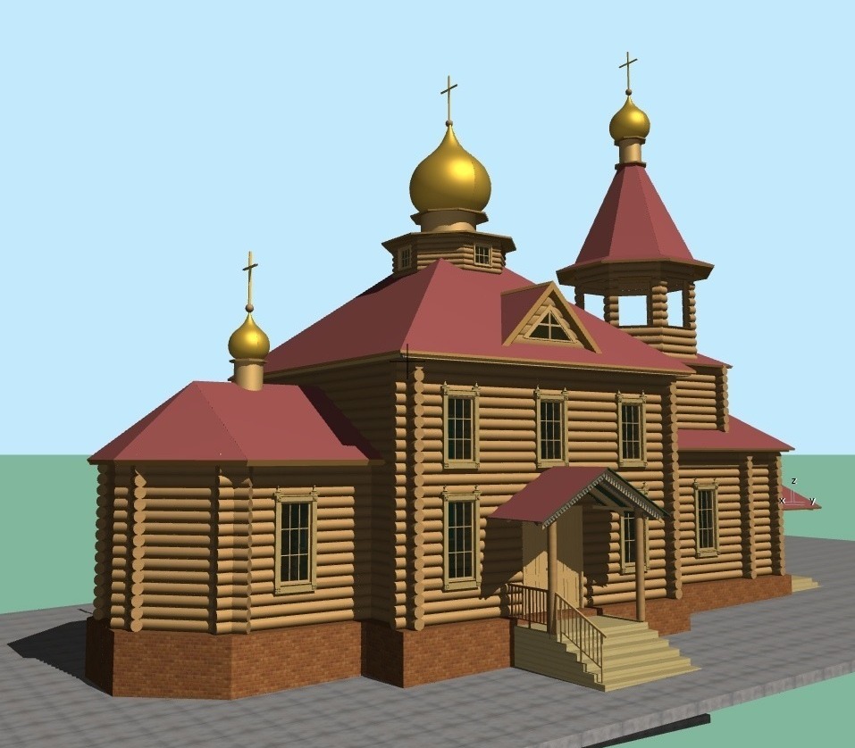 По тем эскизам архитектор составила в специальной программе проектную модель, в которую сразу внесли несколько изменений. Например, изначально предполагалось, что купол с крестом поставят сразу на четырёхскатную крышу без сруба наверху. Элемент со срубом добавили сразу, а позже он претерпел новые изменения.