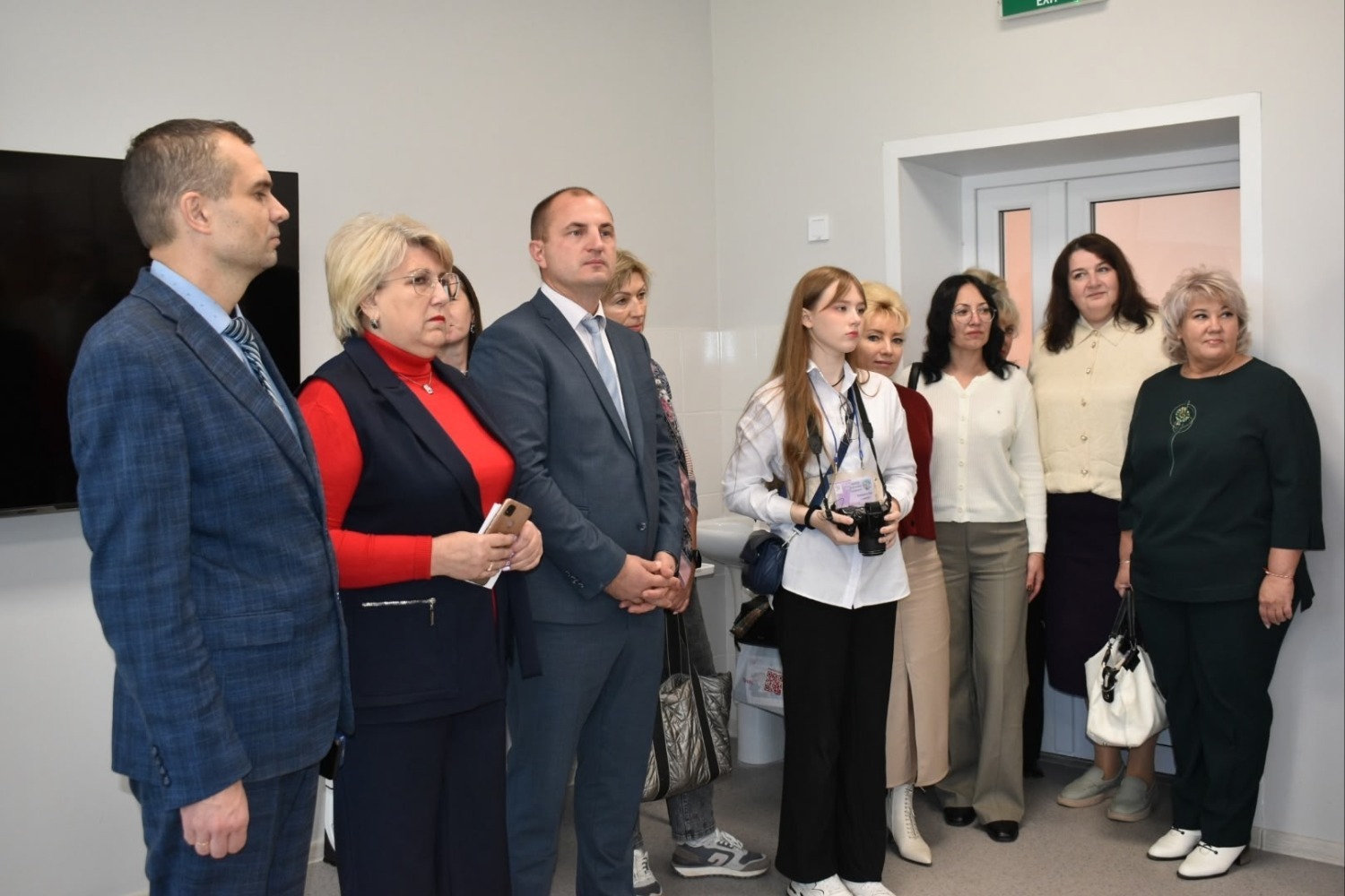 Перед началом официальной части почётных гостей пригласили на экскурсию по школе, недавно обновлённой благодаря капитальному ремонту по нацпроекту «Молодёжь и дети».
