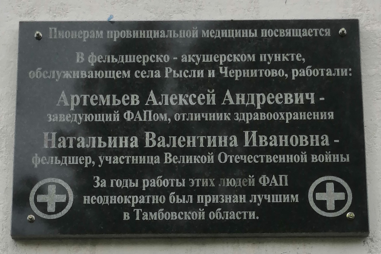 Открытие мемориальной доски на Чернитовском фельдшерско-акушерском пункте состоялось 30 июня 2023 года. А инициатива по благоустройству близлежащей территории возникла после обращения Валентина Левочкина. На официальной странице администрации Моршанского округа Валентин выразил обеспокоенность неудовлетворительным состоянием пешеходной зоны, ведущей к мемориальной табличке «Пионерам провинциальной медицины». Этот сигнал подчеркнул важность поддержания должного вида мест, связанных с памятью о выдающихся личностях.