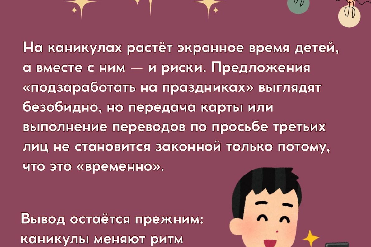 Особое внимание ведомство обращает на безопасность детей и подростков. В период школьных каникул они могут стать жертвами рассылок с предложениями лёгкого заработка. Специалисты настоятельно просят родителей предупредить детей: ни при каких обстоятельствах нельзя пересылать реквизиты банковских карт, коды из СМС или иную личную информацию в ответ на такие сообщения. Любое подобное предложение требует максимальной проверки.