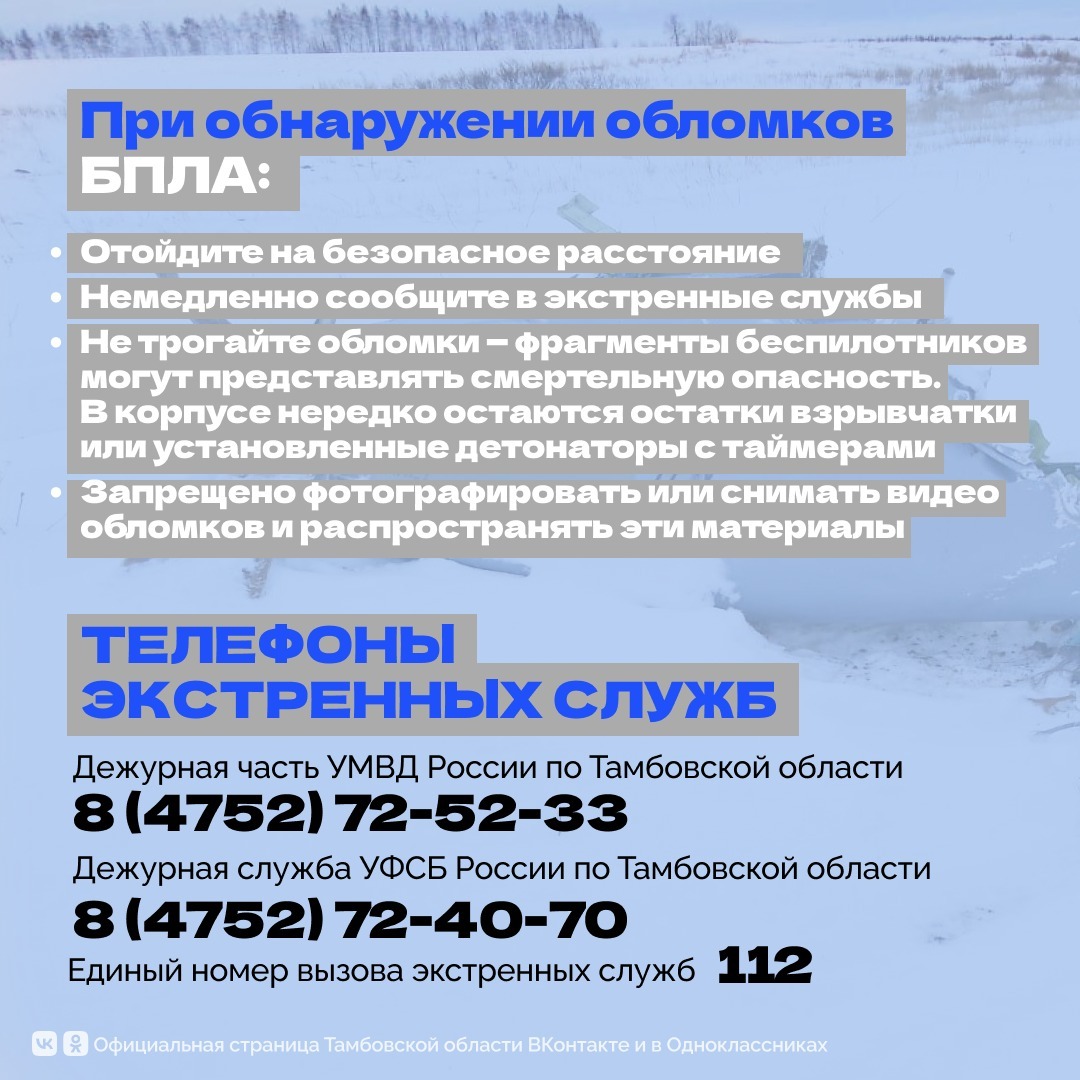 Жителям Тамбовской области в региональном правительстве напомнили, что делать при обнаружении обломков беспилотников. Прежде всего, следует отойти на безопасное расстояние и уведомить экстренные службы о находке.