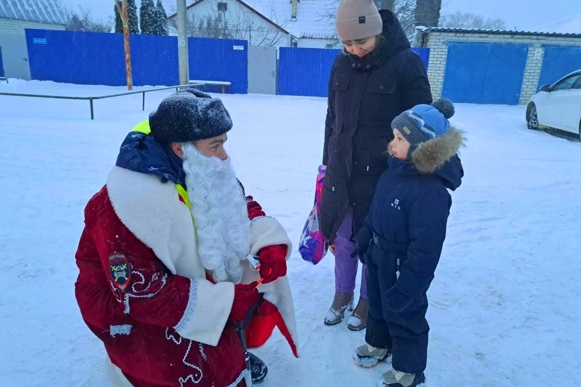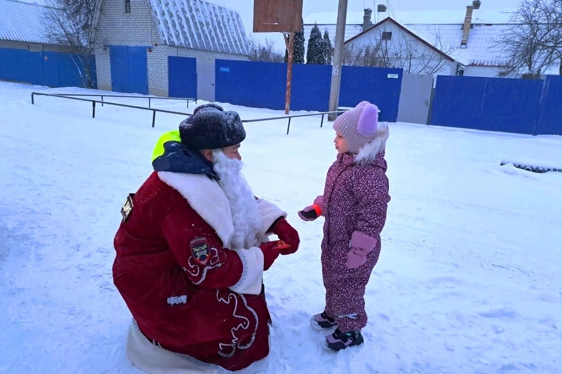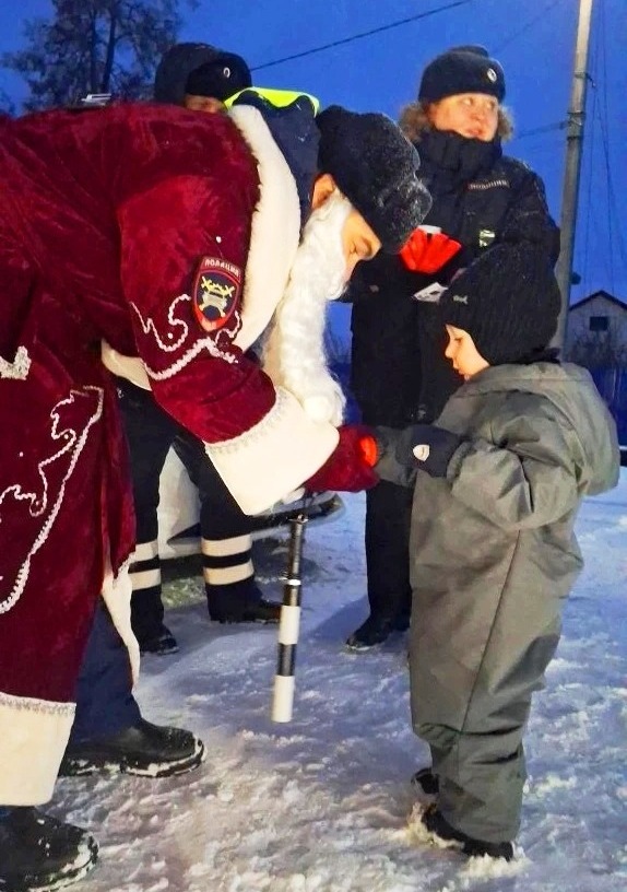 Морозным утром дети с радостью принимали из рук Деда Мороза светоотражающие элементы и сладости, сопровождаемые теплыми поздравлениями с наступающим Новым годом. Ребята были в восторге от появления сказочного персонажа и пообещали соблюдать правила дорожного движения.