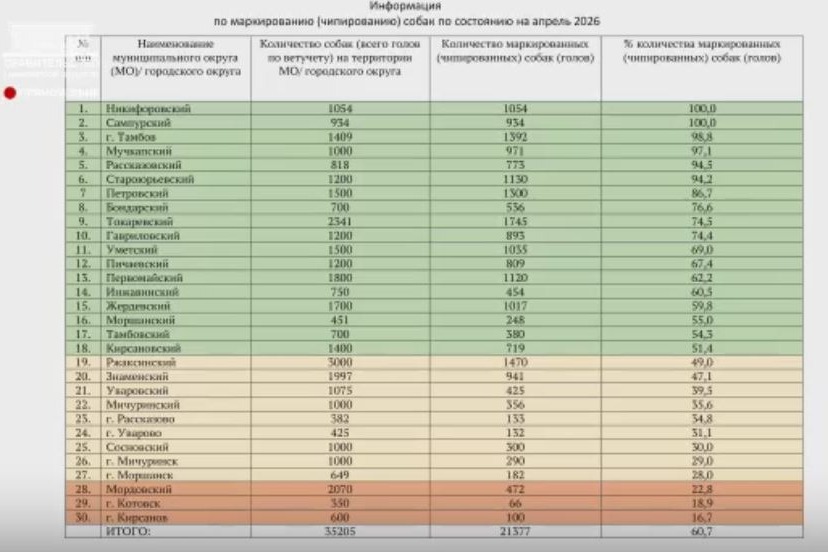 В Моршанске зарегистрировано 649 собак, из них 182 (28%) имеют чип. В Моршанском округе проживает 451 собака, 55% из которых чипированы.
